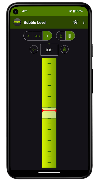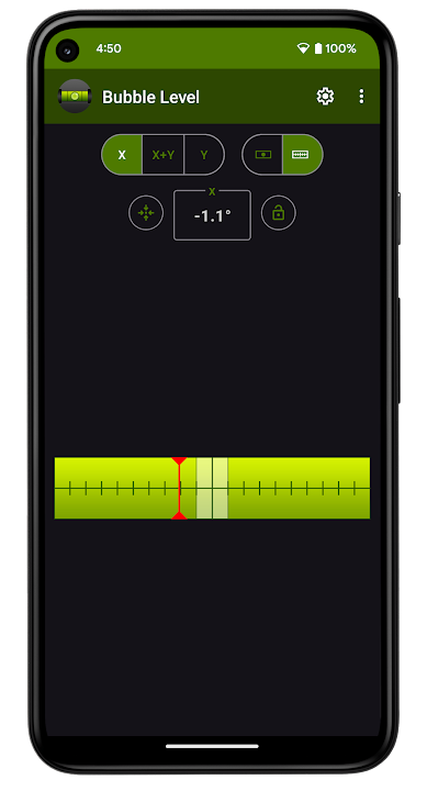 您的设备应该已经由制造商校准。 如果您认为校准不正确,您可以重新校准您的设备。 要校准设备,请按靠近测量角度值的图标(指向中心的四个箭头)。 将手机边缘放在参考表面上,然后按校准按钮。 由于传感器的差异和不平坦的边缘(例如按钮、相机镜头、外壳),需要进行校准。 X、Y 和 X+Y 模式的校准分别设置。