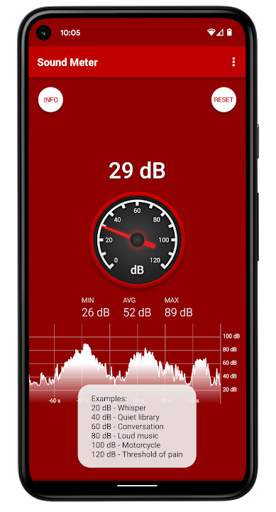 要测量声级?这是智能声级计的应用程序为Android!我们的分贝仪使用的内置麦克风来测量分贝(dB)的音量,并在图形上显示的样本。