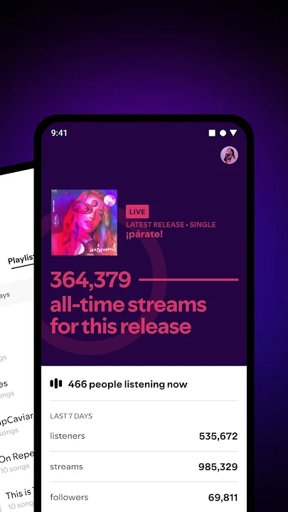 • 通过歌曲、歌单和受众洞察,了解谁在听您的歌,以及您的音乐在哪些平台被听到。