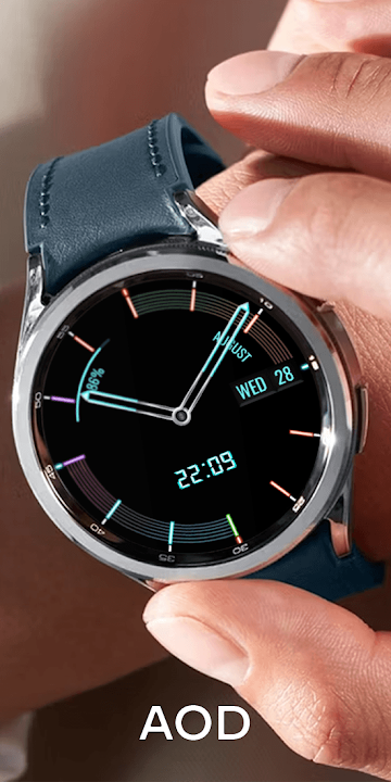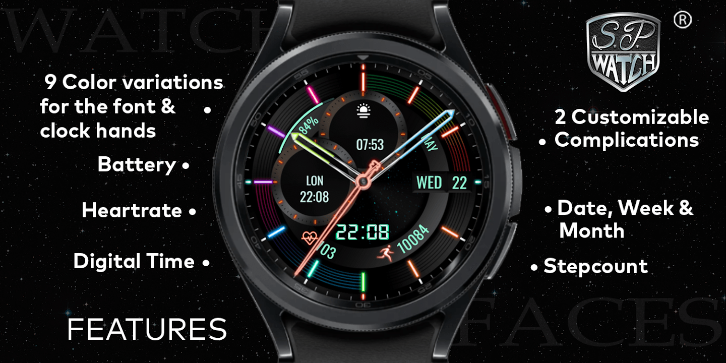 This Watch Face is customizable, offering 9 colors styles, along with 2 customizable complications and 9 clock hands colors. It's designed to provide users with the flexibility to personalize their smartwatch appearance to match their personal taste.