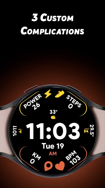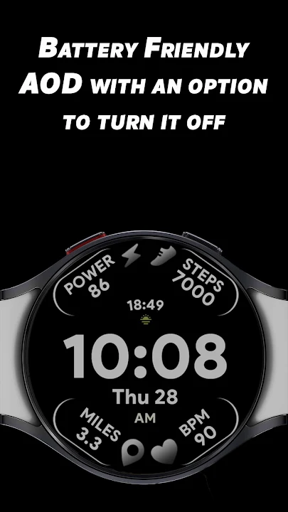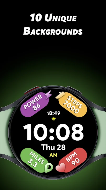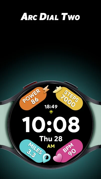 如果您像我一样想要拥有一个带有大粗体字体以及所有信息一目了然的表盘,那么请尝试我们适用于 Wear OS 设备的 Arc Dial 2 表盘。它具有独特的 10 种颜色以及激活自适应颜色的选项,激活后您可以选择另外 30 种独特的颜色。