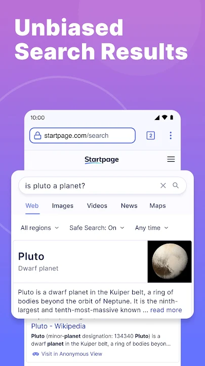 Unprofiled Search Results: Experience search without biases. Startpage delivers unprofiled results, ensuring a fair and impartial exploration of the web.
