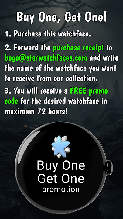 购买表盘,然后将购买收据发送至 bogo@starwatchfaces.com,并告诉我们您希望从我们的系列中收到的表盘名称。您最多将在 72 小时内收到免费优惠券代码。