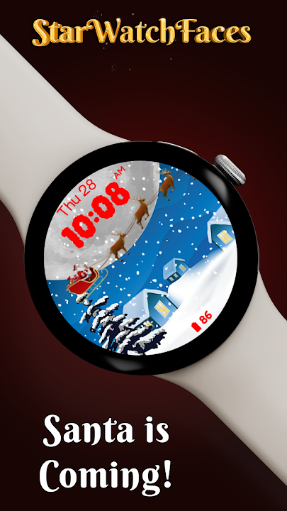 ❄️ Animated Snowfall and Santa Scene: Watch as gentle snowflakes drift across the screen and Santa Claus, with his team of reindeer, flies gracefully in the background. This lively animation adds a touch of winter wonderland charm to your watch.