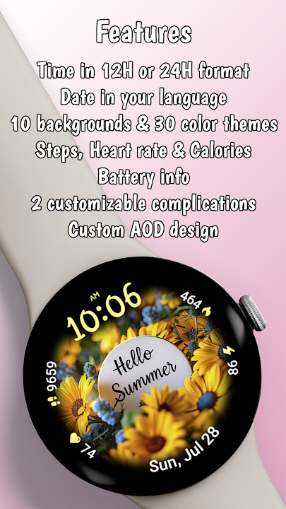 Transform your smartwatch into a blooming garden with Summer Flowers, the ultimate Wear OS watchface that radiates the vibrant essence of summer! Featuring 10 breathtaking backgrounds adorned with colorful, vivid flowers, this watchface is designed to bring a touch of nature's beauty right to your wrist.
