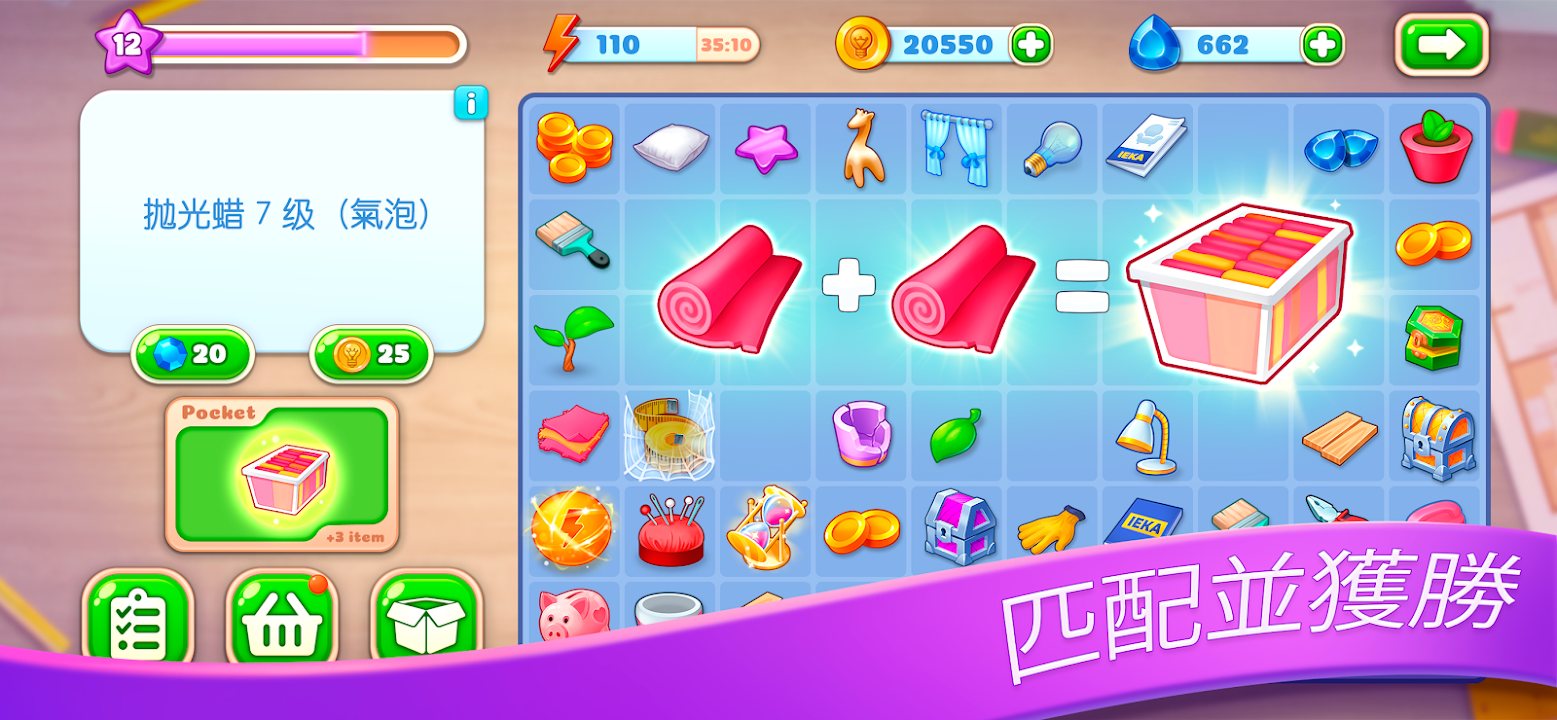 在这款引人入胜的房屋设计游戏中解开有趣的谜题,并逐一完成各个关卡。综合物品和材料来创造出新的家电和家居设计。在合并后的花园中种植树木,获取高质量的木材,并出售额外的物品,为您家庭的装修项目获取免费的资金。根据您的室内装修进度以及客户的满意度获得奖励。