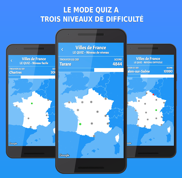 测验:目标是猜测城镇或城市在地图上的位置。您有几个选项可供选择,只有一个是正确的。每个级别都有不同数量的可能答案。快速(和正确)的答案将获得加分。