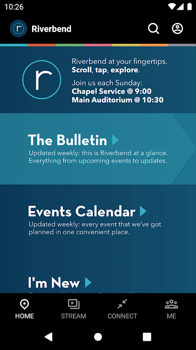 Here at Riverbend Church our message is simple: come just as you are and experience God's grace. It doesn't matter where you are on your journey — rich or poor, young or old, committed Christian or spiritually curious — you are welcome at Riverbend Church. We invite you to experience our services through our app!