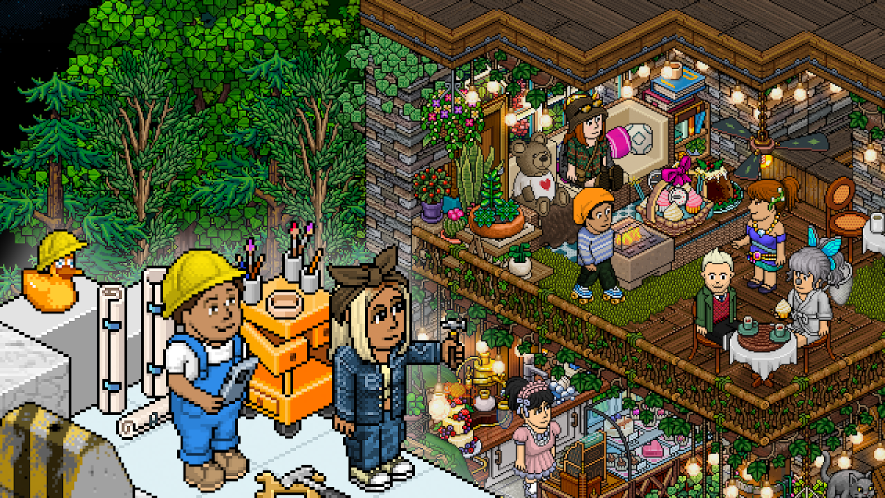 使用各種家具和裝飾品設計和定制您自己的酒店房間!讓您的想像力飛翔,讓您的創造力發揮主導作用!創建舒適的冬季城堡、繁華的賽博朋克街道或瘋狂的科學家實驗室,唯一的限制就是您的創造力! Habbo 已經建造了超過 5 億個房間,玩家使用各種家具和像素物品來創造他們的夢想空間。每月發布新系列!