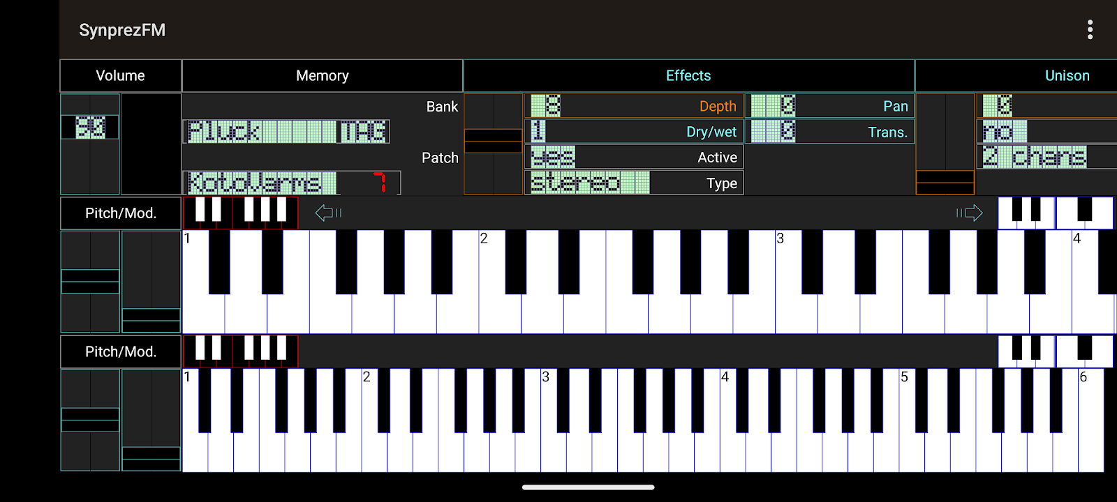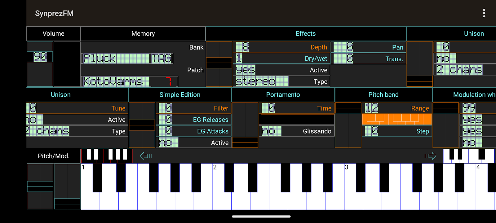 SynprezFM 2 is also a Yamaha DX7 emulator, that can render with accuracy the sysex files you upload into an external storage directory setup by menu, in order to heighten the experience. You can also create and save your own patches, either by editing one of the (deliberately) unsorted builtin ones, or starting from scratch with the 'init voice' function.