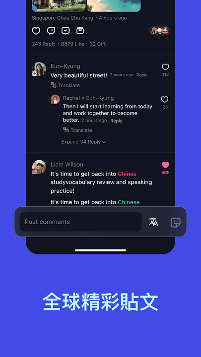 Talkin 的「動態」就像一個多語言的全球社交廣場,讓你足不出戶就能體驗「全球旅行」,拓展國際朋友圈。