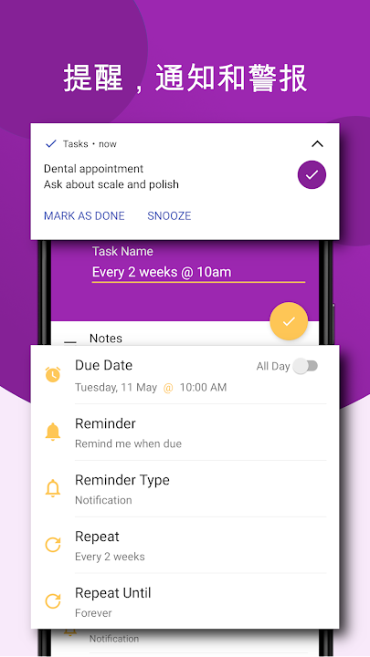 使用提醒功能,以便适时知晓待办事项,并且通过可操作的通知,无需打开应用,只需将任务标记为已完成或稍后提醒。