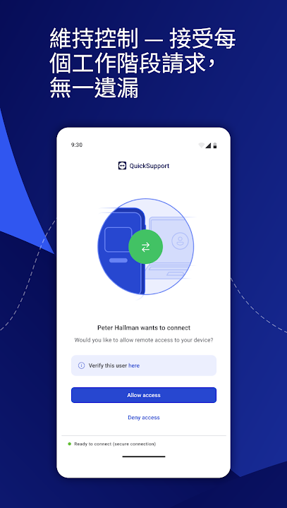 只需幾個簡單的步驟,QuickSupport 即可讓您信任的遠端合作夥伴連接到您的裝置,以便:
