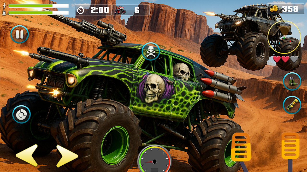 Monster Truck: Battle Game with an ultimate experience of monster truck fighting game & monster truck war game as player attack on other AI monster trucks with machine guns and missiles and they attack the player back with the same weapons.