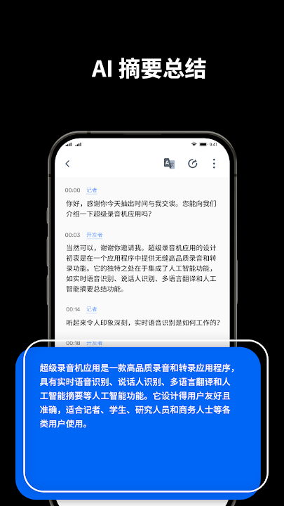 超级录音机,免费的手机录音机和语音备忘录软件,HiFi高音质实时录音转文字,同时支持录音打点+录音剪辑+语音识别转录,录音不限制录制时长,不限制文件分享导出,干净简洁且非常强大!