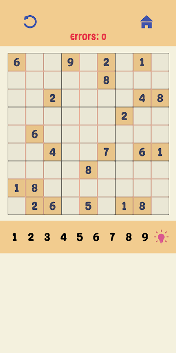 数独的目标是用数字填满一个 9x9 的网格,使每一行、每一列和每一个 3x3 的区域都包含 1 到 9 之间的数字。游戏开始时,9x9 网格中的一些方格会被填满。您的任务是运用逻辑思维,填补缺失的数字,完成网格。请记住,如果出现以下情况,则移动是错误的: