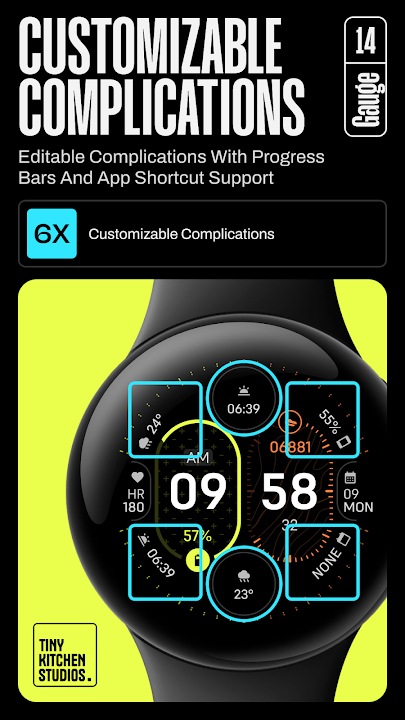 - Modular design: 6 customizable complications to create your own look, 2 circular complications with progress bars support. 4 edge complications with simple design touch for app shortcuts option.