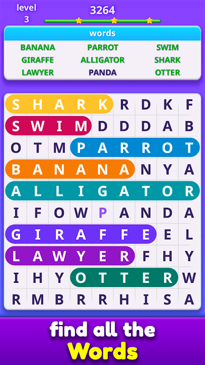 Search word in a fun word search game, improve your memory and train your brain in a relaxing and beautiful word finding game.