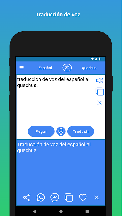 ✓ Using inbuilt voice recognition technology, you can type your text using your voice and then translate the text. This convenient feature allows you to translate regular conversations. You can translate your Spanish voice to Quechua and Quechua voice to Spanish.
