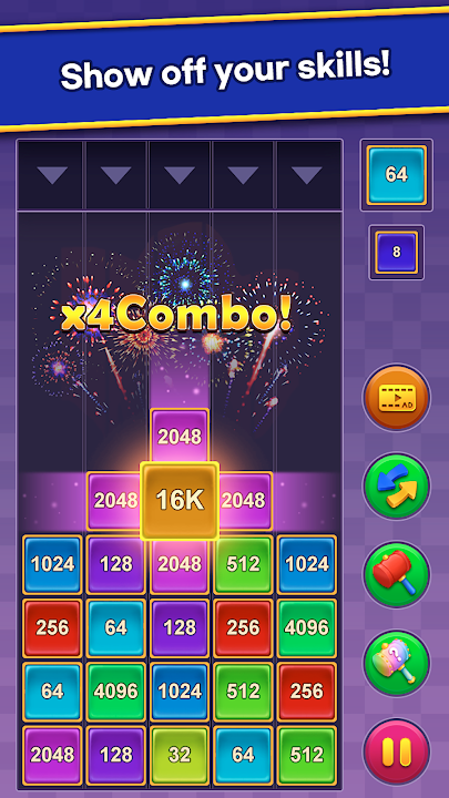 - Earn better scores by combining blocks of increasingly larger numbers of 1024, 2048, 4096.