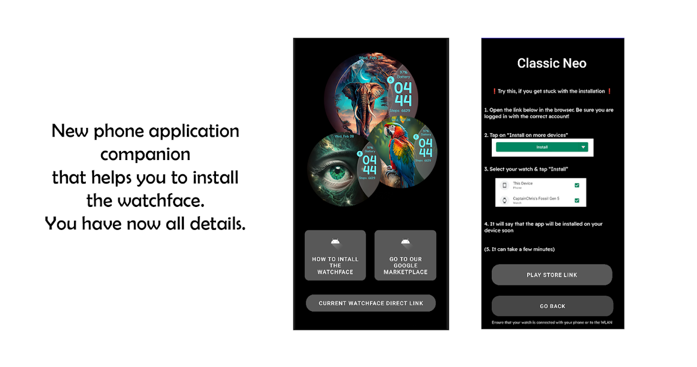 Phone app serves only as a placeholder to make it easier to install & find the watch face on your Wear OS watch. You have to select your watch device from the install dropdown menu.