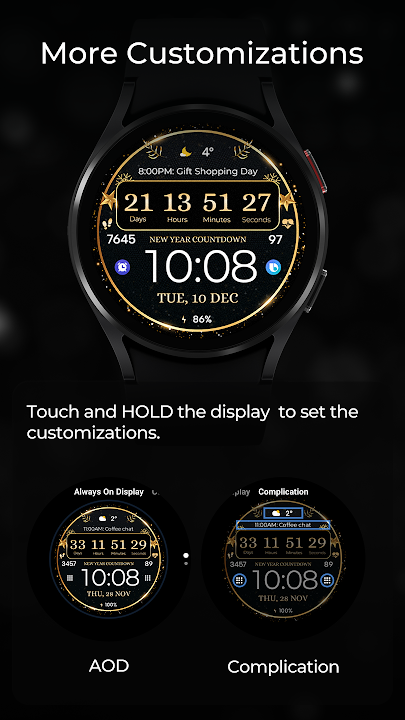 - 數位錶盤,帶有節日新年倒數計時,倒數結束後自動切換為喜慶背景,並於每年 11 月重置。