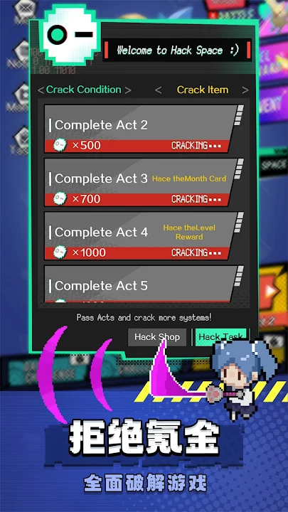 思考良久后,我们决定摒弃错误的方向。于是,这款反"氪金"手游在这个契机下诞生了。初看你可能以为它是一款商业化游戏,其实我们是把内购设计成了一场游戏。玩家通过破解游戏,逐步解锁需要充值才能体验的玩法和内容,击败了来自逼氪老板的力量,最终帮助他找回初心。