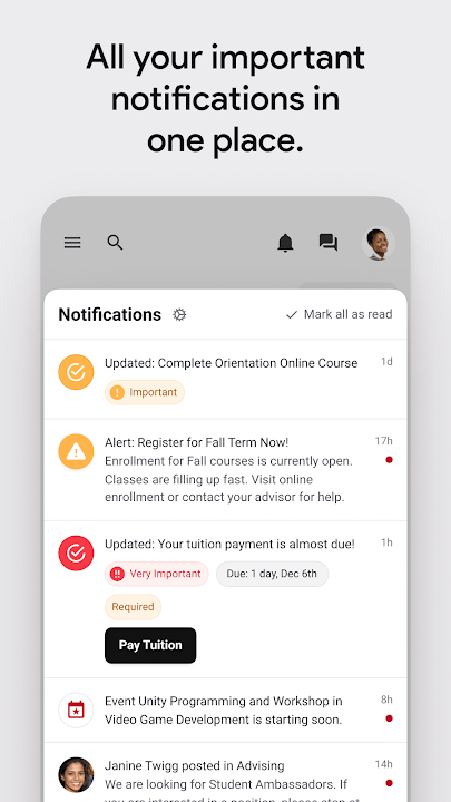 - 接收來自 Canvas 和其他主要校園系統的重要通知