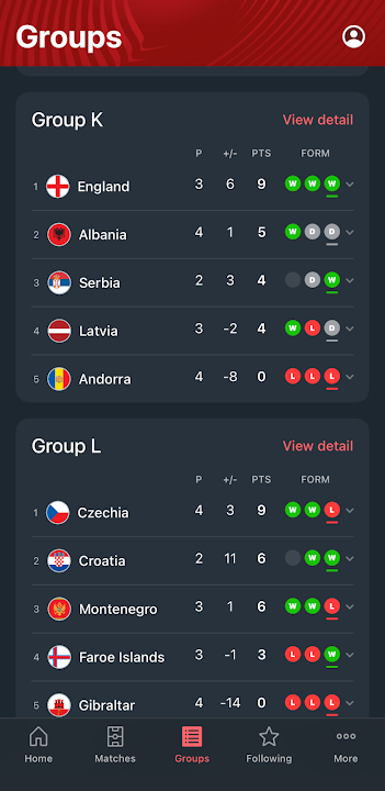 - 查看小組排名,了解您最喜歡的男子國家足球隊在國家聯賽和2026年世界盃歐洲區預選賽中的表現。