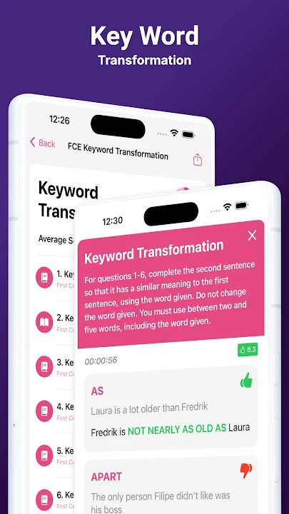 Getting ready for the First Certificate of English? If the answer is yes, this is your app! Crack your B2 FCE exam with our large array of exercises!