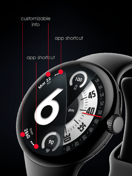 此錶盤需要 Wear OS API 33+(Wear OS 4 或更高版本)。相容於 Galaxy Watch 4/5/6/7/8 系列及更新機型、Pixel Watch 系列以及其他搭載 Wear OS 4 或更高版本的腕錶。