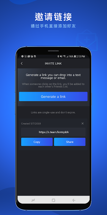 邀请链接:使用链接在 Steam 上添加好友。 生成邀请链接用于短信或电子邮件。