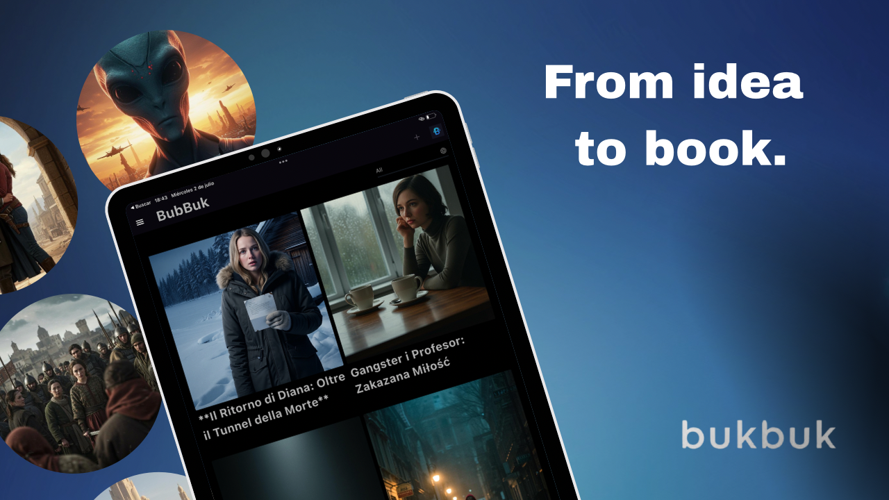 • Automatic audiobook generator: Just write your ideas and BukBuk automatically turns them into high-quality audio narrations.