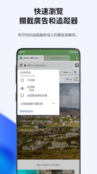 在你的手機和平版上體驗次世代 Vivaldi瀏覽器。隱私分頁、內建廣告攔截工具還有全新的翻譯功能,保證讓你感到驚喜。