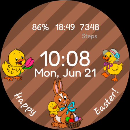 Easter Watchface is an app that provides a watchface for Wear OS devices. It can be configured to use up to 3 complications. Tap on a chicken at the side of the watchface or on the eggs in the bottom to switch it up a little!