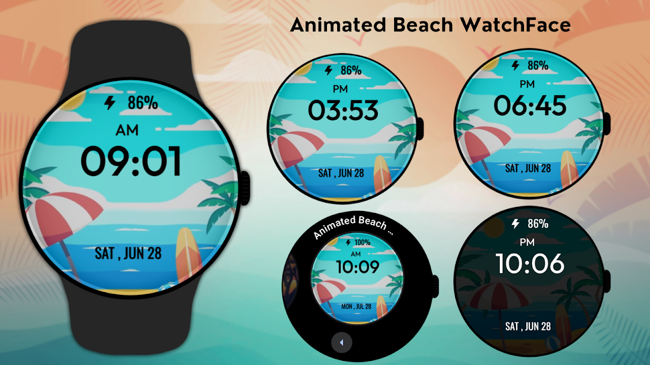 透過 Wear OS 陽光明媚的動畫海灘錶盤感受夏日的氛圍。