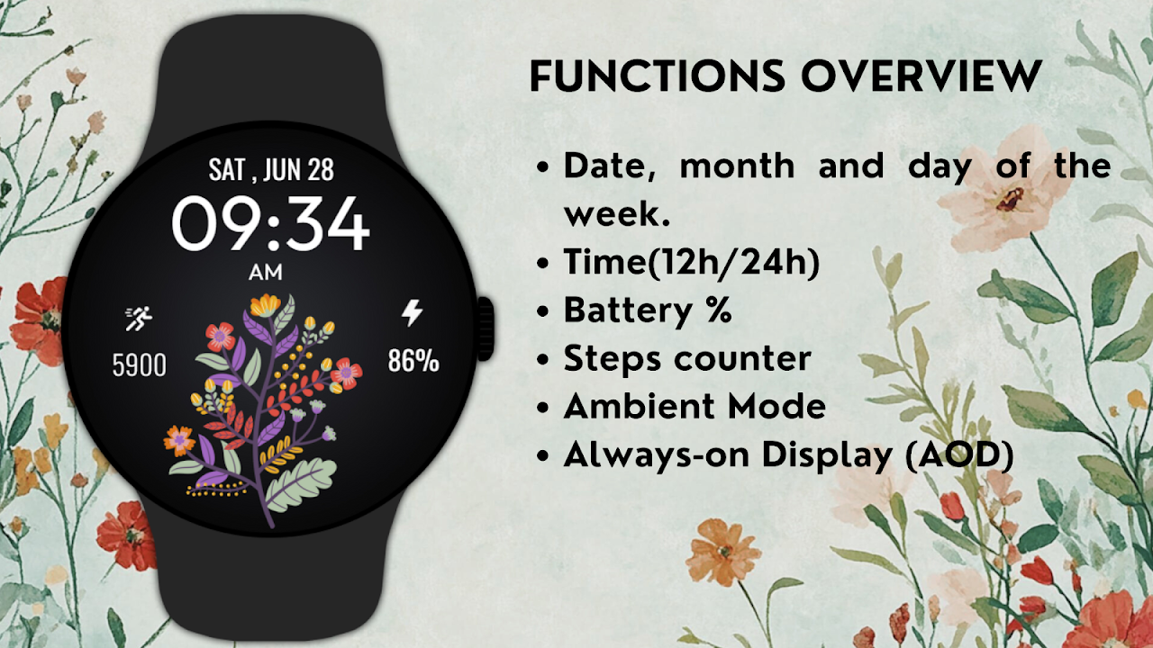 Add a touch of natureโs charm to your wrist with the Beautiful Floral Watch Face for Wear OS. This stunning digital watch face blooms with colorful floral artwork, making every glance at your watch feel fresh and vibrant. Designed for women and floral design lovers, it offers essential health and time-tracking features in a stylish, seasonal format.