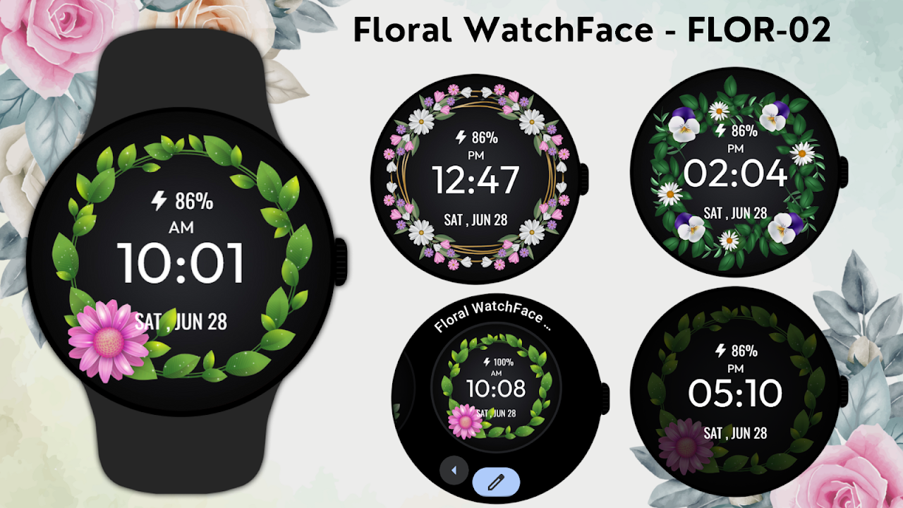 Elegant floral digital watch face for nature lovers on Wear OS.