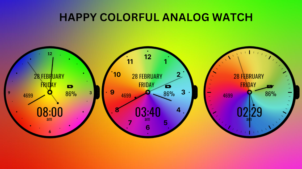Add a burst of color to your wrist with the Happy Colorful Analog Watch Face for Wear OS. Featuring a vibrant gradient background that transitions through multiple cheerful colors, this watch face brings a lively, joyful vibe to your daily routine. Designed with a classic analog layout, it provides a perfect blend of elegance and fun, making it ideal for those who love bright, dynamic styles.