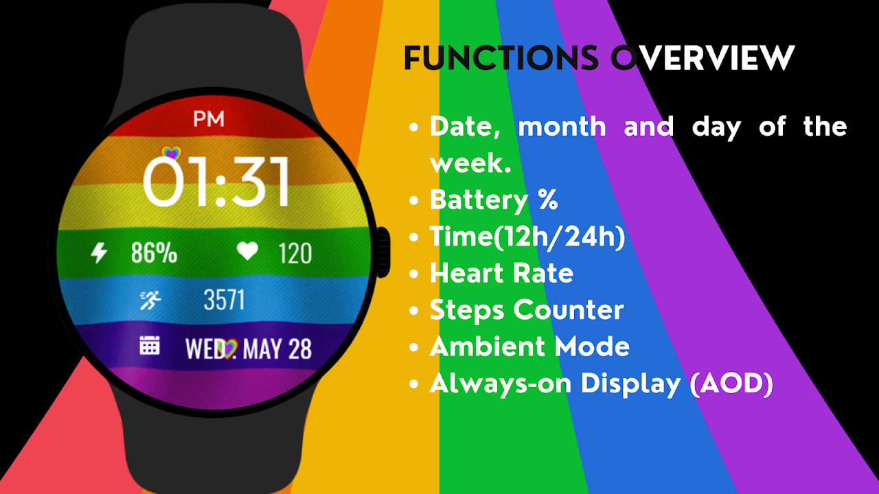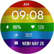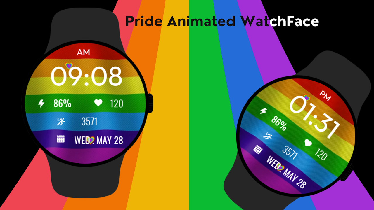 每天透過「驕傲動畫錶盤」展現您的驕傲——這是一款充滿活力和色彩的 Wear OS 數位錶盤,頌揚愛、包容和平等。這款錶盤具有精美的動畫彩虹旗背景和心形裝飾,為您的手腕帶來歡樂和個性。