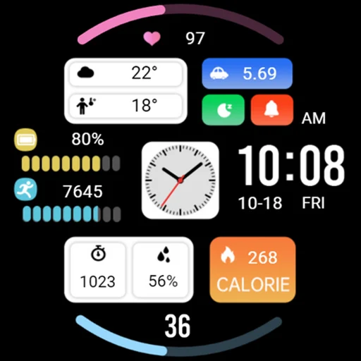 2. 中部區域:上午和下午、功率和進度百分比、步數、步數目標進度百分比、時鐘指針、時間、日期、星期