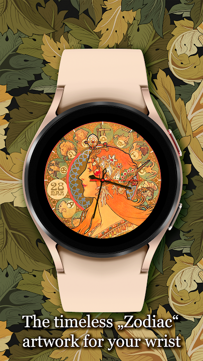 Immerse yourself in the enchanting world of Art Nouveau with this beautifully crafted analog watch face for Wear OS, inspired by the iconic zodiac artworks of Alphonse Mucha.