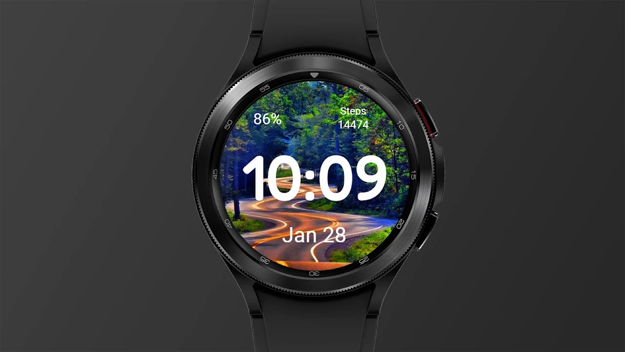 这是 Wear OS 设备的表盘表盘信息:- 数字表盘。- 电池电量显示。- 日期显示。- 步骤显示。- 时尚的背景。