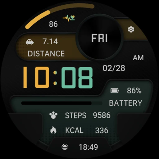 1. Top: Heart rate, heart rate percentage progress, settings, second progress, second, distance