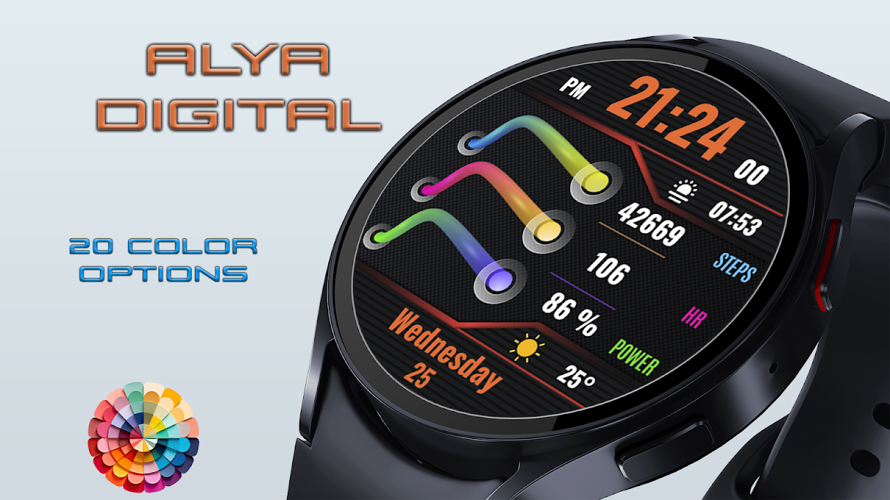 Alya Digital Watch Face is an informative and color customizable digital watch face.
