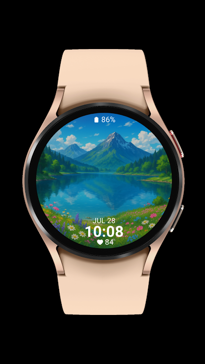 Watch face for Wear OS featuring a peaceful natural landscape: a calm reflective lake, colorful flowers, and mountains in the background under a blue sky with soft clouds. Displays date, time, heart rate, and battery level.
