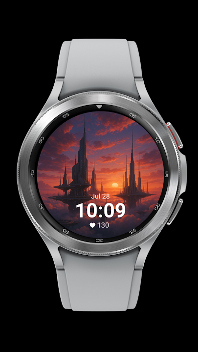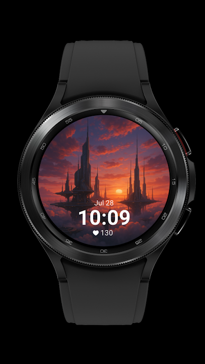 Experience an epic sunset over a futuristic city floating above the clouds. This watch face blends sci-fi art with essential info like time, date, and heart rate — with a customizable meter — elegantly displayed at the center. Perfect for those who want a bold and functional look.