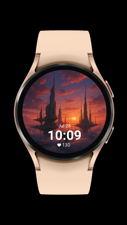 體驗漂浮在雲端的未來城市中壯麗的日落。這款錶面結合科幻藝術與實用資訊,如時間、日期與心率,並支援可自訂的心率指示器,優雅地呈現在螢幕中央。適合追求視覺衝擊與功能性的使用者。