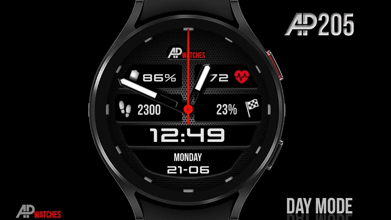 AP205 是一款漂亮的深色錶盤,專為 Samsung Galaxy Watch 打造,但也適用於其他 WearOS 設備