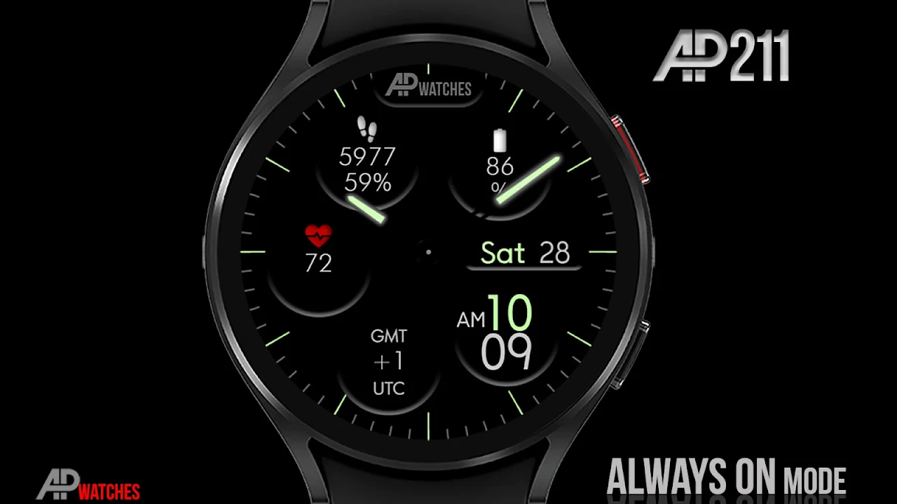 AP211 is a realistic analog watch face with green accents.